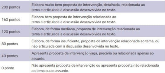 5. Respeito aos direitos humanosApresentar uma proposta de intervenção para o problema abordado que respeite os direitos humanos. Propor uma intervenção para o problema apresentado pelo tema significa sugerir uma iniciativa que busque, mesmo que minimamente, enfrentá-lo. A elaboração de uma proposta de intervenção na prova de redação do Enem representa uma ocasião para que o candidato demonstre o preparo para o exercício da cidadania, para atuar na realidade em consonância com os direitos humanos.Eis os seis níveis de desempenho:(Portal MEC)