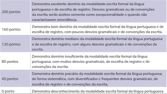 1. Domínio da escrita formal da língua portuguesaÉ avaliado se a redação do participante está adequada às regras de ortografia, como acentuação, ortografia, uso de hífen, emprego de letras maiúsculas e minúsculas e separação silábica. Ainda são analisadas a regência verbal e nominal, concordância verbal e nominal, pontuação, paralelismo, emprego de pronomes e crase.São seis níveis de desempenho:(Portal MEC)