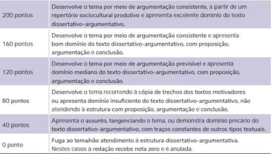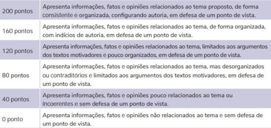 3. Selecionar, relacionar, organizar e interpretar informações, fatos, opiniões e argumentos em defesa de um ponto de vistaO candidato precisa elaborar um texto que apresente, claramente, uma ideia a ser defendida e os argumentos que justifiquem a posição assumida em relação à temática da proposta da redação. Trata da coerência e da plausibilidade entre as ideias apresentadas no texto, o que é garantido pelo planejamento prévio à escrita, ou seja, pela elaboração de um projeto de texto.Eis os seis níveis de desempenho:(Portal MEC)