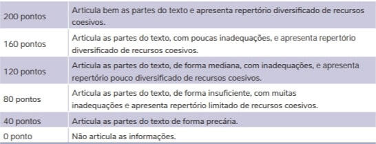 4. Conhecimento dos mecanismos linguísticos necessários para a construção da argumentaçãoSão avaliados itens relacionados à estruturação lógica e formal entre as partes da redação. A organização textual exige que as frases e os parágrafos estabeleçam entre si uma relação que garanta uma sequência coerente do texto e a interdependência entre as ideias.Preposições, conjunções, advérbios e locuções adverbiais são responsáveis pela coesão do texto porque estabelecem uma inter-relação entre orações, frases e parágrafos. Cada parágrafo será composto por um ou mais períodos também articulados. Cada ideia nova precisa estabelecer relação com as anteriores.Abaixo, seguem os seis níveis de desempenho:(Portal MEC)